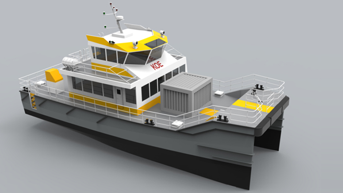 KOE301是一艘20米全铝合金双体高速风电运维船,采用DAMEN 2008母型船设计,具备25节航速,可乘坐12名乘员(另配5名船员),在7级风和2.5米有义波高海况下仍可安全出海。独特的战斧式船艏和升高前甲板可有效减少船艏升沉和海浪抨击,大推力顶靠机位可保证运维人员的安全登乘。该运维船已于2021年5月10日开工建造,预计将于同年11月完工并投入使用。该风电船的引入将为目前国内海上风电运维市场提供新的海上交通解决方案,将帮助海上风电运维市场朝着专业化、精细化的方向前进。